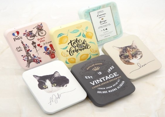 ソフトな感触のマット調の蝶番付きの缶です。デザインによって縦開き・横開きが可能です。ベースカラーとして、くすみカラーの6色を展開しております。蓋の天面にはお客様からご提供いただく画像データ(イラストレーター) を用い、ご希望のデザインをインクジェットで印刷いたします。